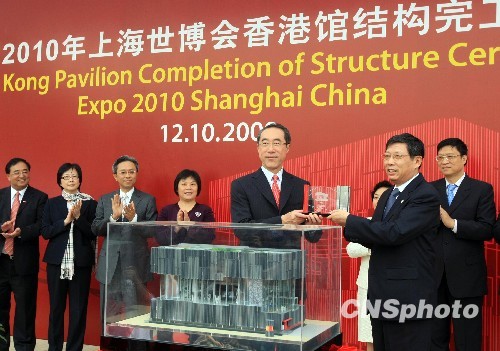 10月12日,上海世博会香港馆结构完工仪式在世博园区举行。香港政务司司长唐英年(右三)和上海市副市长杨雄(右二)出席仪式并互赠礼物。中新社发 汤彦俊 摄