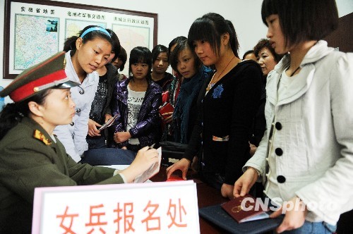 10月18日,在安徽省亳州市谯城区人武部,众多女青年正踊跃报名应征入伍。今冬,安徽省征兵政策将有较大调整,除了放宽高学历青年的年龄限制外,还将女兵征集办法由过去的分配指标、推荐报名改为面向社会公开征集。中新社发 张延林 摄