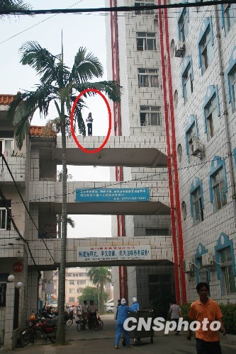 10月19日上午,广西钦州市第一人民医院天桥上,一名刚和男友分手不久的女子在检查出怀孕后一时想不开欲跳楼。女子最后被钦州市消防支队特勤官兵飞身救下。中新社发 田华松 摄