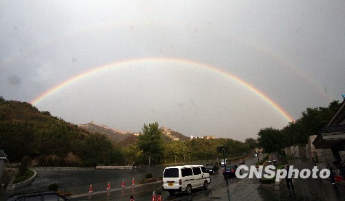 10月12日16:30,一场小雨不期而至,八达岭北四楼上空乌云密布,宛如一块大幕展开,而西侧的阳光却已经照射出来。16:40左右,一明一暗两条彩虹横跨长城。此间专业气象人士介绍,八达岭景区三面环山,一面临水,长城又处于东侧山脊之上,因此下午骤雨初晴时阳光从西侧照射,出现彩虹几率较大,但同时出现两道彩虹是近十年来的第一次。中新社发 张民 摄