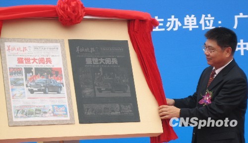 10月21日,世界首张“石头报纸”亮相第六届中国(云浮)国际石材科技展览会。该“报”以《羊城晚报》10月1日报道“盛世大阅兵”的头版为原形,首创用1比1花岗石去镌刻一整版原报,图文并茂,共容纳了1867字符、1张主图和3张配图。其中,最小的文字为六号字,依然清晰可见。“石头报纸”已向吉尼斯总部申报一项新的吉尼斯记录并获受理。图为中共云浮市委书记王蒙徽为“石头报纸”揭幕。中新社发 黄耀辉 摄