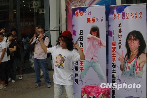 11月1日,广西南宁闹市,网络红人“豆浆王子”向路人展示才艺,以筹钱整形进军娱乐圈,引起民众围观。“豆浆王子”姓蒙,长相怪异,穿着独特,两年前开始以搞怪行为和舞蹈才艺娱乐广西网民,拥有一定名气,人称“北有芙蓉,南有豆浆”。中新社发 王刚 摄