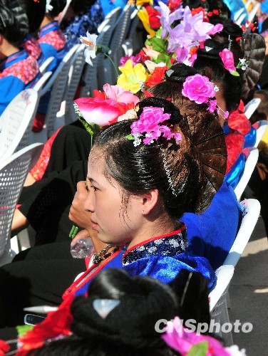 11月1日,福建湄州妈祖祖庙祭典,海内外信众如潮涌入莆田祭拜,湄洲女梳着妈祖头用最真诚的形式热情欢迎八方客。同源同祖的符号元素就在她们的头顶上“妈祖头”――头顶发型呈船帆状,发髻代表船帆,两侧的银卡子代表船桨,中间的红头绳代表缆绳,头顶上的簪子代表锚,以示她们是海的儿女。吸引大批海内外妈祖信众及媒体关注。中新社发 张丽君 摄