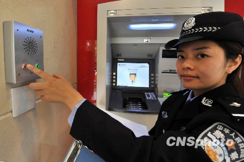 11月5日,江苏省南京市各大银行ATM自助取款机营业点正式启用新型紧争求助设备,南京市公安局经保处的民警正在对多家银行的“紧急求助器”和加装了新型防护器材的ATM取款机进行抽检。 这种新型的“紧急求助器”设有紧急呼叫和业务咨讯两个按键,与公安机关联网的银行安保中心24小时为用款市民提供紧急呼叫服务,银行安保人员通过“紧急求助器”上的视频、音频设备可以实时了解取款人和周边情况。 为保护市民使用银行ATM机的取款安全,南京各家银行根据警方要求不仅统一了防窥档板的标准尺寸,而且对ATM取款机全部安装了密码“防窥罩”、方便取款人观察身体后方情况的球面“后视镜”等安防器材。中新社发 海风 摄