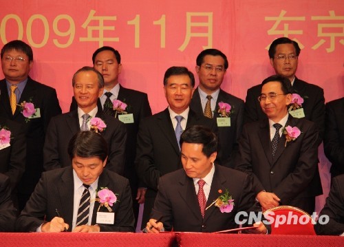 11月5日上午,2009年中国广东——日本经贸合作交流会在日本东京市内酒店开幕。会上,双方企业代表在中国驻日大使崔天凯、广东省委书记汪洋、广东省委常委朱小丹等同志的见证下签署了19个、总额达6.36亿美元的合作协议。中新社发 关妍 摄