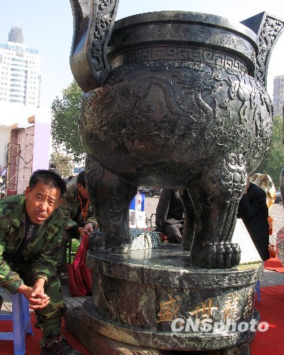 十一月五日,由中国珠宝玉石首饰行业协会和国土资源部珠宝玉石首饰管理中心联合举办的2009中国国际珠宝展在北京中国国际展览中心开幕,来自世界十五个国家和地区的六百多个展商参展,三万平米展区内设立了一千五百个展位。业内人士认为,这是真正的“危机下依然火爆的珠宝展”。图为辽宁珠宝商家在国展广场展示巨大的岫玉雕刻成的“盛世龙鼎”。中新社发 邹宪 摄