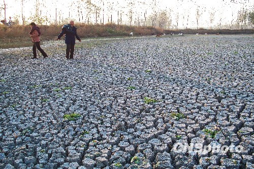 11月5日下午,河南省开封市南郊两位农民正从干涸的鱼塘走过。由于天干少雨,河南省开封市近期出现较为严重的旱情,造成播种小麦大面积出芽率低,出苗不全,抗旱浇麦保苗任务异常繁重。中新社发 李俊生 摄