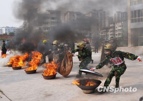 11月9日,一场别开生面的消防志愿者运动会在四川省内江市举行,180余名消防志愿者通过参加火场逃生、紧急着装、运水接力、疏散物资、巧灭油火、伤员救助等项目的比赛,提高了消防意识和业务水平。中新社发 兰自涛 摄
