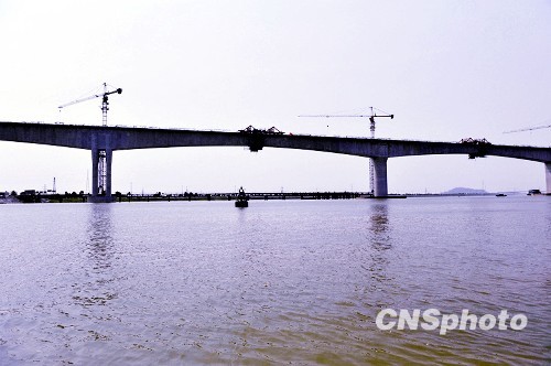 11月11日,由中国铁建十四局集团施工的广深港铁路客运专线上四孔一百六十八米的连续钢构桥全部成功合拢建成,该举创中国高速铁路连续钢构桥跨径之最,填补了中国铁路桥梁建设空白。中新社发 刘德联 摄