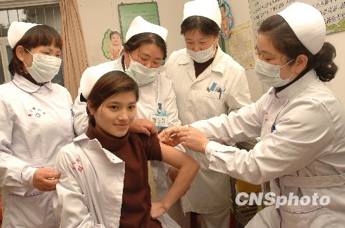 11月11日,安徽芜湖的甲型H1N1流感疫苗接种工作启动。接种工作坚持知情、自愿、免费和重点人群优先的原则,首次接种的重点人群为公安干警,医疗卫生人员,中小学师生和关键岗位公共服务人员等。中新社发 陈立希 摄