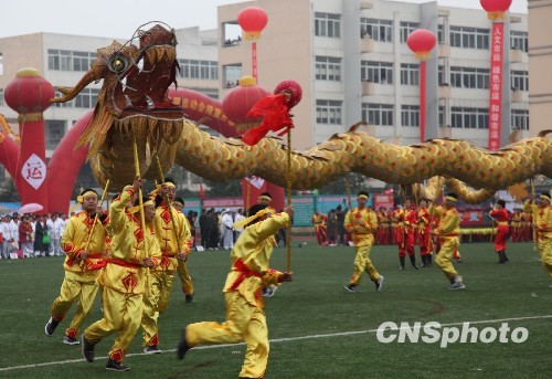 11月18日,四川眉山市第二届运动会开幕,来自该市“中国竹编艺术之乡”青神县由31名男子舞动表演的一条长68米的竹编巨龙连同4条各长14米的小竹编龙的精彩表演,让观众为之喝彩。中新社发 尧遥 摄