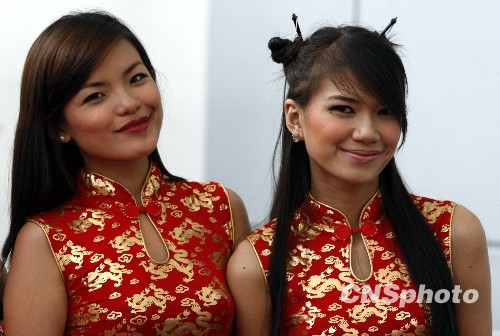 11月19日,第十届世界华商大会暨中国机电展在菲律宾首都马尼拉举行。图为菲律宾姑娘着旗袍迎宾。中新社发 张宇 摄