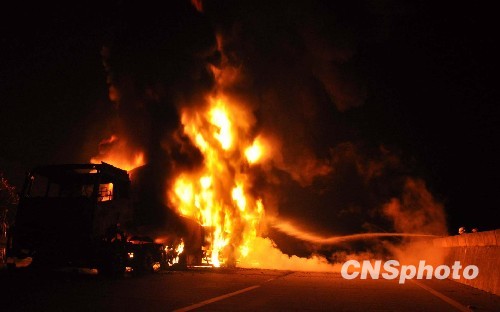 11月23日凌晨,广西桂林市境内,一辆满载橡胶制品的货车途经桂柳高速公路时突然起火。桂林消防支队接警后迅速调集40名官兵奋战3小时后成功将大火扑灭。中新社发 赵剑 摄