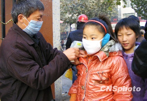 11月23日,河南省温县第一实验小学师生在入校前接受体温探测。为严防甲型H1N1流感的传播,该县各中小学校全面实施晨检、疫情监控日报告制度等措施,并加强流感防治知识的普及,增强师生流感防控意识和能力。中新社发 徐宏星 摄
