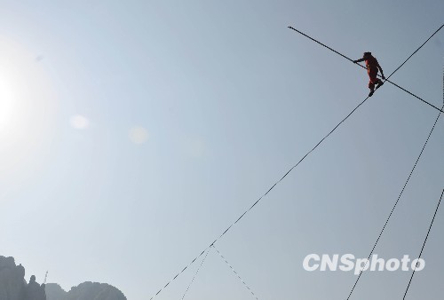 11月23日下午,新疆“达瓦孜”传人艾斯开尔结束在福建太姥山景区49天的高空生存挑战。高空生存挑战期间,艾斯开尔在无任何保护措施下,在高约100米、跨度约500米的钢丝上成功进行了百米速跑,以44秒63再次创造了高空百米冲刺的吉尼斯纪录。2007年,艾斯开尔曾创下高空百米冲刺的吉尼斯纪录——57秒24。中新社发 詹托荣 摄