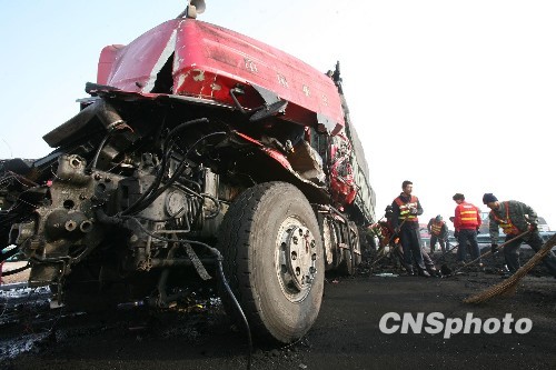 11月23日清晨,新疆G216国道一辆运煤车发生煤炭自燃,司机停车查看时,后车刹车不及,导致10辆大货车连环相撞。目前,警方已介入调查,事故原因与损失正在进一步核实中。中新社发 刘新 摄