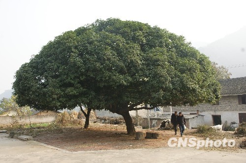 11月25日,湖北郧县五峰乡南北峰村有一对“千年夫妻”桂花树。据悉,这两株桂花树相距8米,两树搭肩而立,树枝相互融合。一株桂花树是光开花不结果被称为“雄树”,另一株是结桂花果的“雌树”。据有关专家考证,这对“夫妻”桂花树的树龄约有1000年。中新社发 袁野 摄