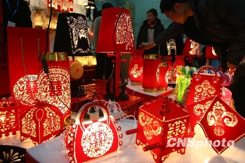 11月27日,2009北京国际礼品展在国贸中心举办,来自中国的500家礼品展商携带上万种新奇礼品亮相。图为具有浓郁中国风的剪纸画装饰灯具参展。中新社发 富田 摄