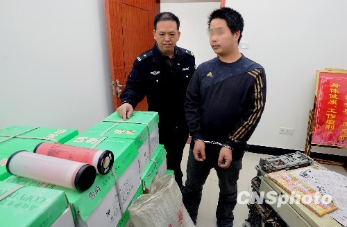12月3日,福州仓山区金山派出所民警带一名犯罪嫌疑人对缴获的非法“六合彩”宣传材料及小广告成品进行指认。据警方介绍,12月2日晚,福州仓山治安大队、金山派出所出动警力一举端掉藏匿在辖区建新镇橘园洲工业区仓山园小区一商品房小阁楼内的特大非法印刷地下窝点,抓获4名犯罪嫌疑人,现场缴获用于非法印刷“六合彩”宣传材料和小广告的誊印机4台,滚筒墨盒100多个,印刷纸40多箱,“六合彩”宣传材料和小广告成品5000多份,用于印刷排版的电脑及激光打印机各1台,总价值约20余万元。目前,该案件正在进一步审理中。中新社发 刘可耕 摄