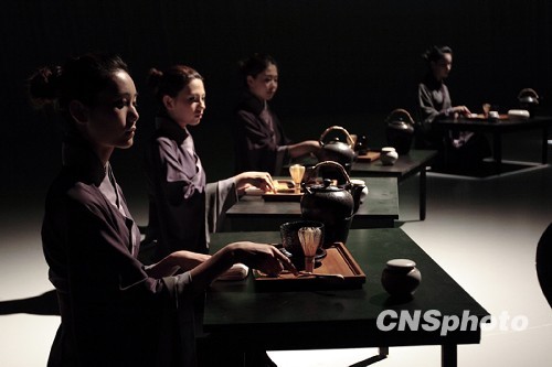 12月7日,北京朝阳区委与崔各庄乡政府联合梦公园文化艺术有限公司,在草场地艺术区示范项目“十方”--京城最具创意的艺术聚会空间举行体验活动,通过礼、观、味、品、视等不同侧面,真正体验中国唯一有画廊、餐饮、茶演的主题剧场,欣赏一部由艺术家、中国文化产业拓荒者许斐最新创作的舞台剧力作“十方”。图为中国宋代茶礼表演。中新社发 梦园 摄