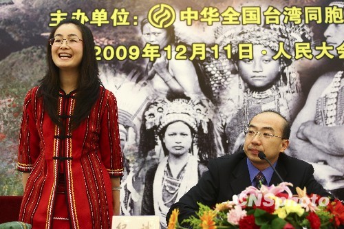 12月11日,全国台联副会长纪斌在北京召开的“台湾少数民族历史文化展”发布会上,介绍本次活动的泰雅族新闻发言人陈小艳。“台湾少数民族历史文化展”将于12月21日在北京民族文化宫展览馆举办。此次展览是首次比较系统和全面地介绍台湾少数民族历史文化的大型主题展览,以照片、影像、文字、器物的形式一一呈现出台湾少数民族14个族群的历史、文化和生活。展览期间,还将举办台湾少数民族历史文化研讨会、台湾少数民族歌舞展示等活动。中新社发 杜洋 摄