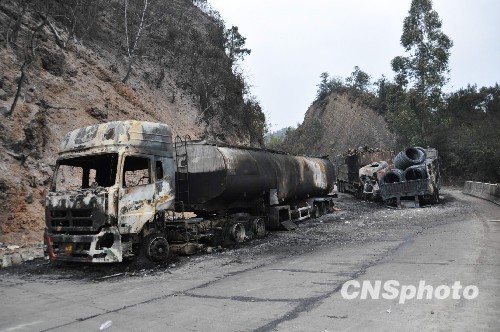 十二月十四日凌晨,广西贺州市境内发生三车相撞事故,一辆汽油槽罐车遭追尾后汽油泄漏并引发大火,造成追尾车辆上三人被烧死。当地消防部门接警后迅速派出二十多名官兵赶往事故现场扑救。至当日十一时许,火势得以控制。中新社发 梁铭秀 摄