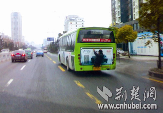 12月15日下午2时许,武昌读者方先生在秦园路路口看到,一名中年男子竟扒在一辆公汽后面,十分危险。方正 摄