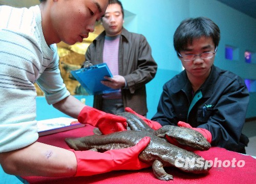 日前,新疆乌鲁木齐市渔政站水生野生动物救助中心成功救助两只大鲵(娃娃鱼)。据工作人员介绍,两只“娃娃鱼”是由热心市民送来的,其中体型较大的娃娃鱼体长达70厘米,体型较小的也有60厘米,按照这两只娃娃鱼现有的体型来看,至少生长了10年以上。中新社发 刘新 摄