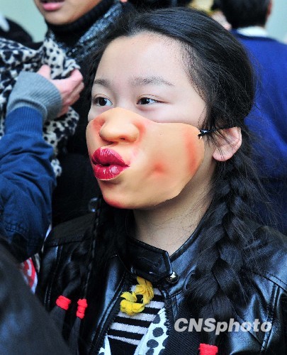 12月20日,福州街头一位女孩的红唇立体口罩受人关注。随着气侯变冷,即能防寒又能预防流感的口罩成为冬日扮靓的又一热点。中新社发 张丽君 摄