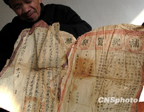 12月21日,山东邹平县青阳镇耿家村刘志国展示他家中保存完好的三张契约,这三张契约分别是民国时期“补买契”、“补税买契”、“验买契”。中新社发 高发芳 摄