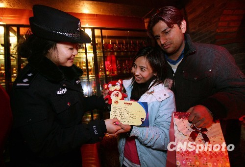 圣诞节前夕,北京西城警方出入境管理处在海内外客人集中的什刹海地区开展法律宣传活动。图为警方为外国游客们发放精心准备的“圣诞礼物”,包括虎年玩偶和民警提示手册,详细介绍外国人在京住宿登记、烟花爆竹燃放、防诈骗、防煤气中毒等相关的涉外法律知识和安全常识。中新社发 张岩 摄