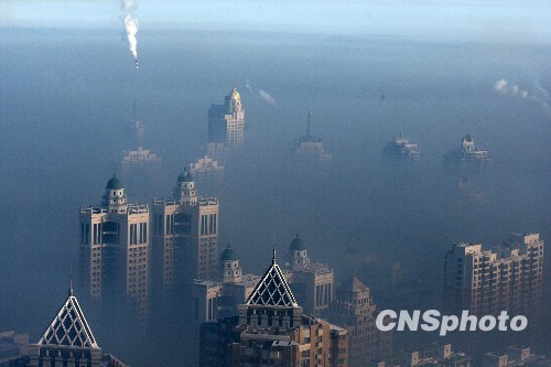 12月23日,哈尔滨市出现了浓重的大雾天气,凌晨的时候部分地区能见度不到百米,从高空看去,一些高楼在雾中若隐若现。中新社发 靖阳 摄