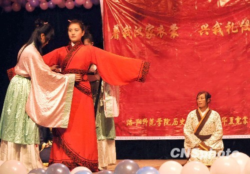 12月22日晚,洛阳师师范学院的汉服爱好者们聚集一堂,为一名在校女生举行了传统的女子成人礼。成人礼在我国古代是表示该女子已经跨入成年人行列。成人礼仪式庄严而肃穆,在场的20多位汉服爱好者按照传统的 “三加”、“三拜”、“置醴”、“蘸子”、“字笄者”、“聆训”、“笄者揖谢”,最后“礼成”。据悉,汉服爱好者大都来自师院的历史学院和文学院等,对祖国传统文化有着更为浓厚的兴趣。中新社发 cba 摄