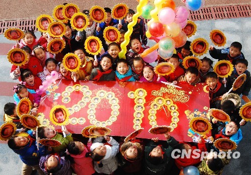 12月31日,在江西九江小学操场上,60名二年级的小学生抬着一幅用自己的笑脸图片拼成“2010”字样的展板喜迎新年的到来。中新社发 胡国林 摄