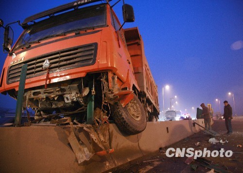 1月4日,新年的第一天上班,在石家庄槐安路高架桥上,一辆由西向东行驶的大货车,左前轮跃上1米余高的隔离带,造成该路段两侧车行缓慢,索性没有人员伤亡。图为隔离带上的货车。中新社发 翟羽佳 摄