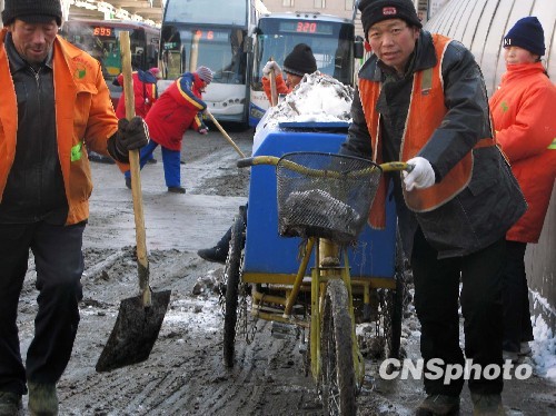 1月6日,在暴雪过后天气最为严寒的时刻,北京西站公交总站环卫工人全部出动,开始彻底清理车站路旁积雪,便利旅客安全乘车。中新社发 邹宪 摄