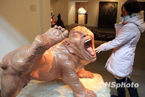 1月6日,名为“一个强烈的哈欠”雕塑在上海某创意园区展示,夸张的形态“雷”观众。该作品意在通过生活常态,来释放都市人压抑的心情。中新社发 潘索菲 摄