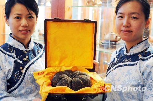 1月6日,由云南资深藏茶人珍藏的开“金花”的“金瓜班章王” 普洱茶极品生茶在福州首次举办的顶级普洱茶品鉴会上亮相,令榕城普洱茶友难得以一睹其芳容。据了解,不少痴迷于收藏班章普洱极品的藏茶人,大都听说过陈年普洱熟茶会开“金花”,但陈年普洱生茶也会开“金花”,实属罕见。中新社发 刘可耕 摄