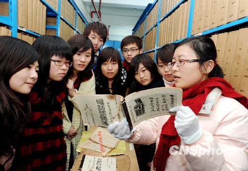 1月7日下午,福建一所高校学生在福建省档案馆工作人员陪同下,来到该馆档案保管库房首次得以目睹民国时期电话号码簿等珍贵档案。当日,为推动传统档案馆向公共档案馆转型,现为国家一级档案馆的福建省档案馆首次对外开放参观该馆档案保管库房和档案安全监控中心等部门,160多名高校师生首次目睹该馆馆藏的许多珍贵历史档案。中新社发 刘可耕 摄