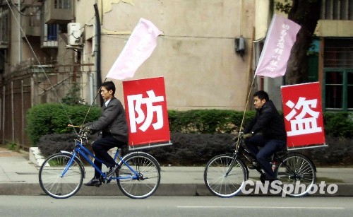 1月7日,岁末隆冬时节,福州一卖钥匙的商家让工作人员骑着自行车写上大大的“防盗”二字上街做宣传,颇具创意。中新社发 王东明 摄