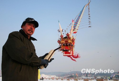 1月10日,沈阳市大东区人鹰共舞俱乐部的王升举在冰雪节上放飞50米长的巨龙风筝。当日,2010沈阳国际冰雪节、盛京灯会、关东庙会开幕式风筝大赛在沈阳棋盘山冰雪大世界举行,数十个风筝参加比赛。中新社发 刘宝成 摄
