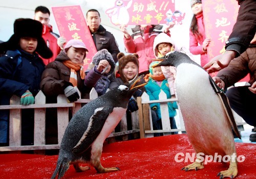 1月13日,作为哈尔滨冰雪节四大景区之一,哈尔滨极地馆为助威冰雪节,特别开展哈尔滨城市旅游吉祥物南极企鹅“曼波”在冰天雪地中与游客互动的活动,为第26届中国·哈尔滨冰雪节增添一份喜悦和欢乐。中新社发 姚庭山 摄
