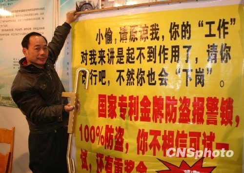 1月13日,广西南宁一男子展示一把近20斤重的怪锁,并配以文字调侃小偷。该锁是男子苦心研究4年所造,据称能让小偷“不改行就下岗”。当日,广西科技活动周在南宁举行。中新社发 王刚 摄
