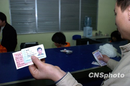 2010年1月21日,广铁集团开售实名制火车票,广东地区的试点车站包括广州、佛山、深圳、东莞东等9个车站,实名制车票的票面上记载的旅客姓名、有效身份证件号码等信息。图为一旅客用身份证购买到实名制火车票。中新社发 罗仰明 摄