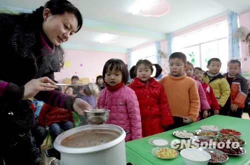 2010年1月21日,湖北省市供销幼儿园的小朋友们就开始品尝腊八粥,老师通过形象的食材向孩子们诉说腊八粥的故事,让孩子们了解民族传统文化。 中新社发 文铭 摄