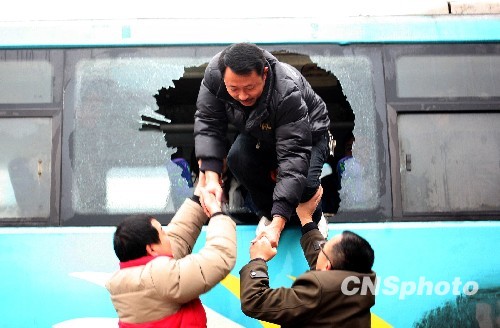 2010年1月24日,四川华蓥市汽车客运站的驾乘人员和旅客在开展春运遇险逃生演练。一年一度的春运即将来临,四川省华蓥市公路运输管理部门组织全市出租车、公交车和汽车客运站的驾乘人员及旅客,分别开展春运安全应急演练,确保春运安全。中新社发 邱海鹰 摄