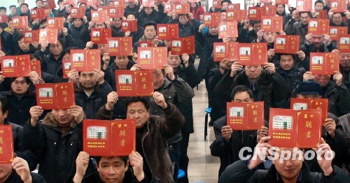 1月24日,山东省巨野县17个乡镇的320名村级劳动保障协理员经过系统的培训后正式上岗,成为专门服务农民就业的“职业红娘”。据了解,为了促进农民就业,山东省巨野县劳动保障局打造一支专业化、职业化的劳动保障协理员队伍,实现了县、镇、村三级农民就业服务网络“全覆盖”,使广大农民足不出村便可以找到合适的务工岗位。中新社发 王齐波 摄