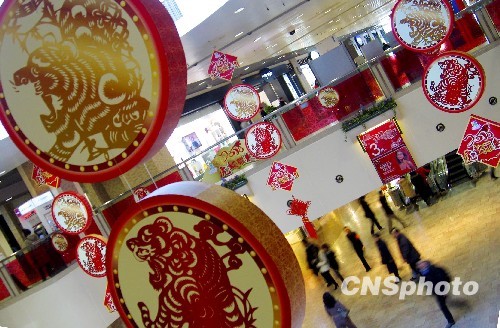 1月25日,北京一家商场里挂满虎年装饰,营造出浓浓的春节气氛。中新社发 杜洋 摄