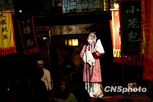 1月25日,北京王府井小吃街上,商家用京剧表演吸引顾客,给热闹的街道增添了不少传统韵味。中新社发 杜洋 摄