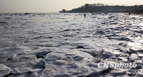 1月25日,由于气温有所回升,河北省沿海秦皇岛、唐山、沧州三地的冰情正在逐渐缓解。近日,受数次较强冷空气的持续影响,河北沿海部分岸段遭遇30年来罕见海冰,秦皇岛海域浮冰最大外缘线为5海里,冰厚达12-18厘米。面对罕见的海冰现象,该省港口积极采取应对措施,随着气温回升,海港浮冰已降至3至4厘米,各港口电煤运输逐步恢复正常。图为秦皇岛老龙头景区的海冰已开始“解冻”。中新社发 翟羽佳 摄